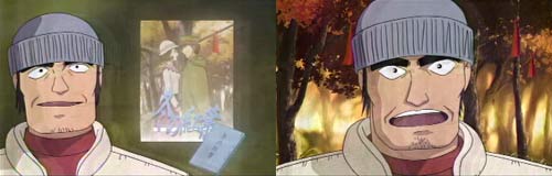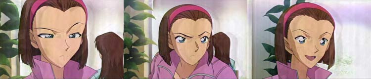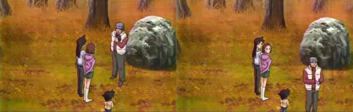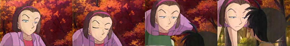 それがタメもなく一気に左の絵から右の絵に変化するので、「フッと足下見たらハンカチ落ちてたのに気付き園子に言う」という演技の、「“フッと”見て“気付く”」という部分が全く出来てない。もう少し時間配分考えてコンテ切ってくれ。