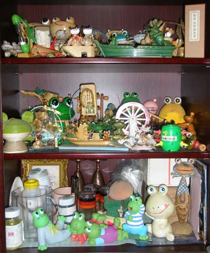 見よ、この、棚を埋め尽くすカエルグッズの数々を(笑)