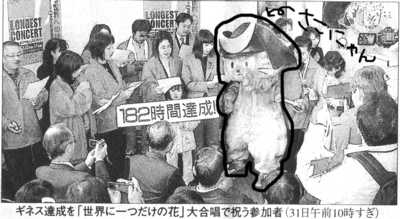 ひこにゃんが城に釘付けになっているのを良いことに、メディアが大勢集まり世界にその情報が発信されるギネス記録の表彰式に、なんと、さこにゃんの着ぐるみが参戦!