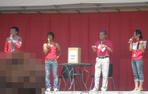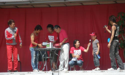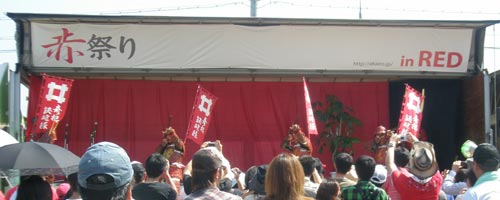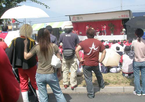おモチ効果で、簡易ステージの周りにはすでに人だかり。「赤いものを持ってきた人、大歓迎」ということで、赤シャツの人間が多い。
