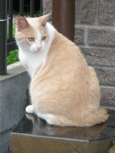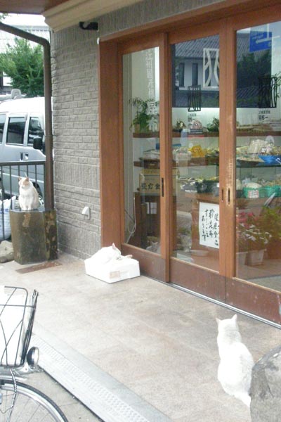 端の白ネコは、出入りする客にニャーニャー鳴いて、抗議なのかアピールなのか…